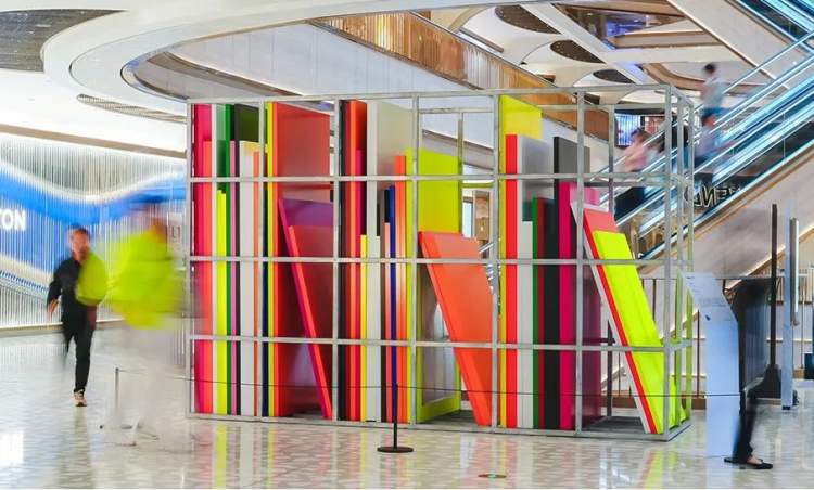 在石区L1层室内,可以看到艺术家丁乙的装置作品《阁架》,这是一个把艺术家的工作室“搬到”商场公共空间的荧光色装置,再现了艺术家的日常场景,用艺术家对色彩独特的审美来装点商场空间。