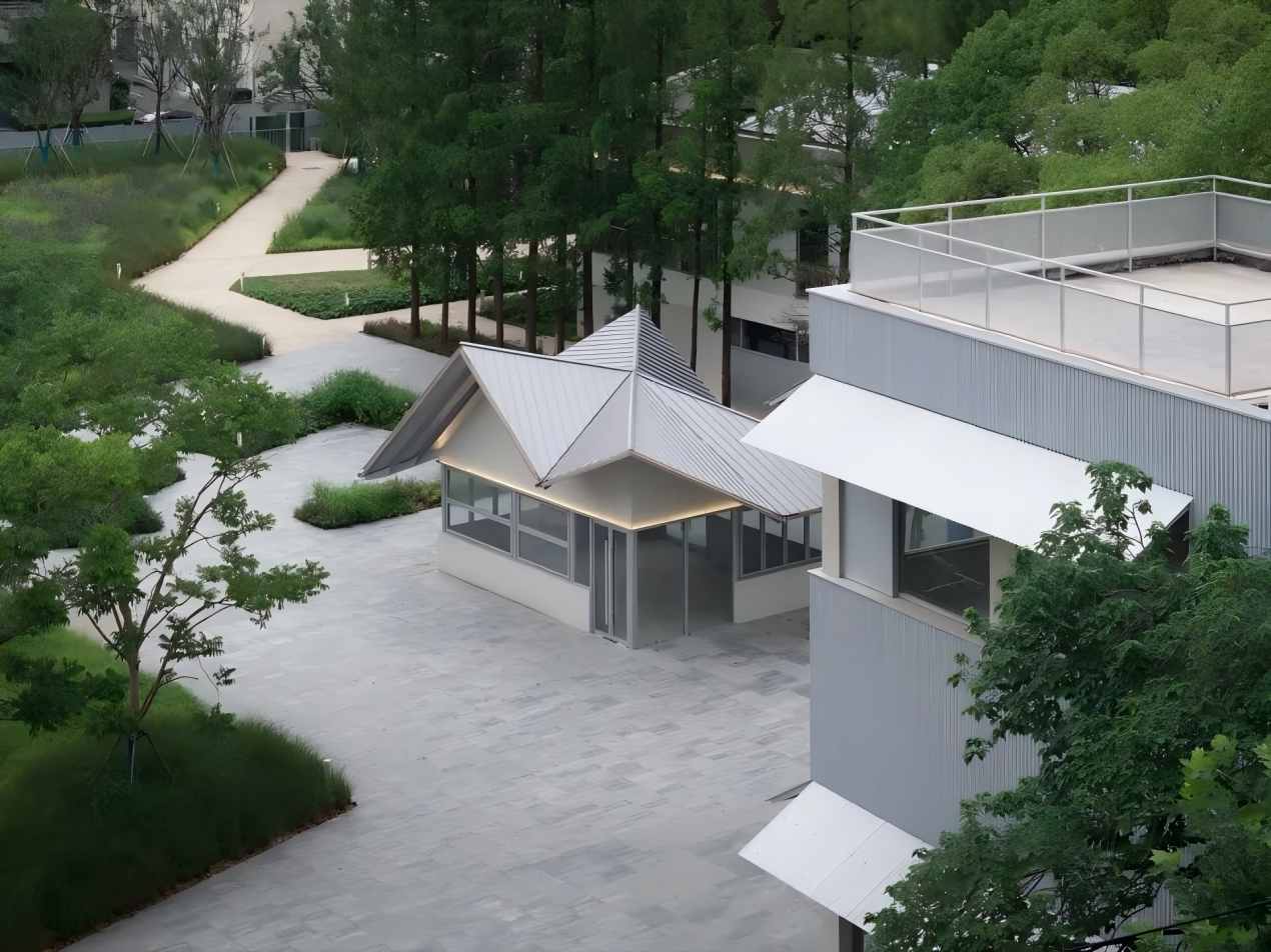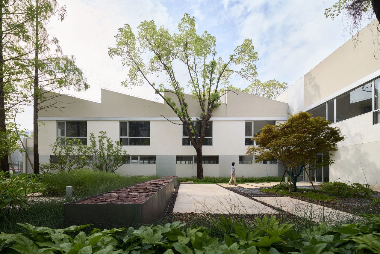 面向广场的一侧,波纹镀锌钢板如被掀起的礼物盒般向上扬起,形成生动的入口意象。另一侧朝向小广场的轻钢结构景观构筑物,以折纸般的不规则屋面构成深远出檐,四边微微抬起,造型极具艺术气息,尤其适合文艺风咖啡店使用,其吧台可完全敞开,能巧妙融汇室内外空间。